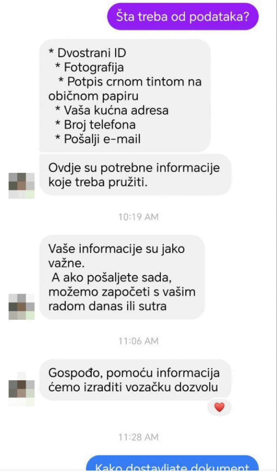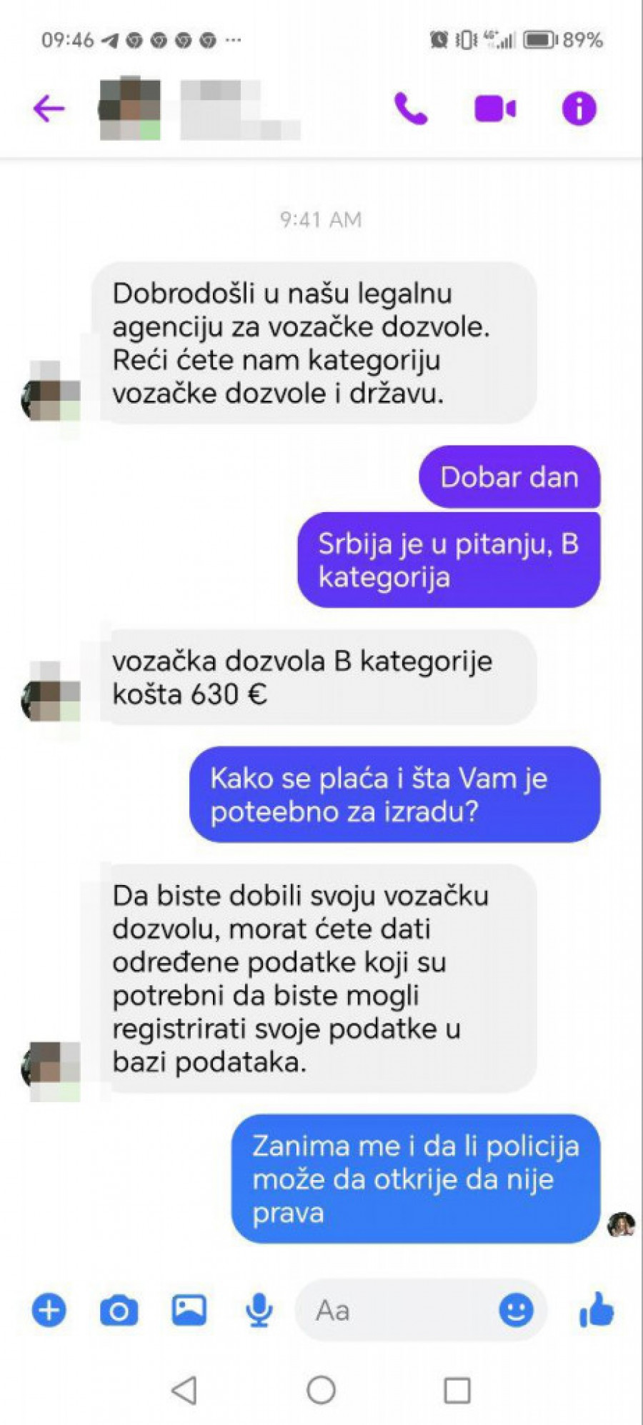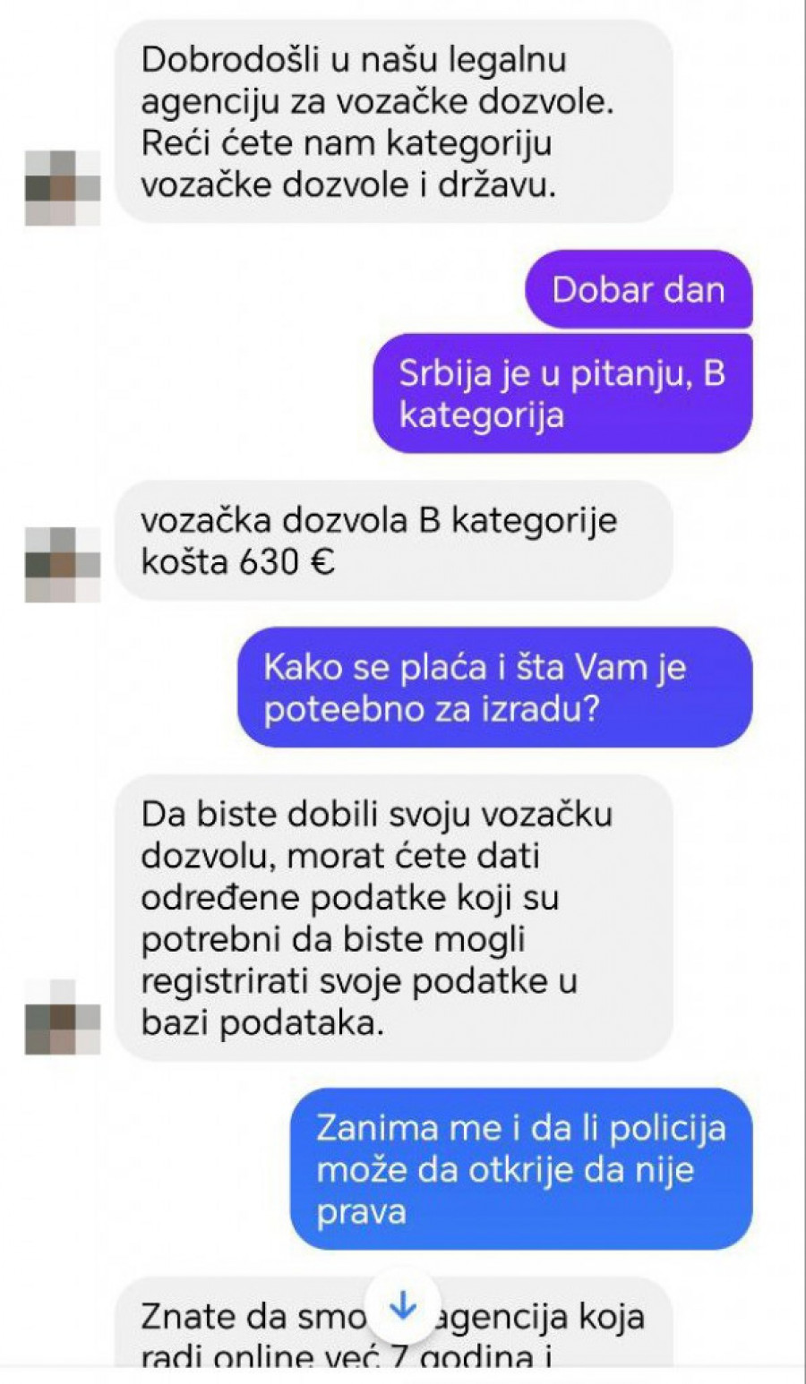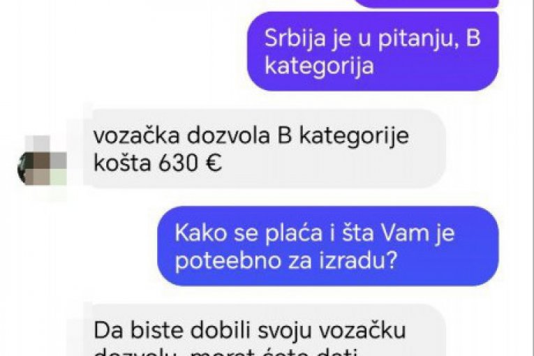 Za vozačku dozvolu "B" kategorije tražila je 630 evra, a dozvolu će, kaže, poslati na kućnu adresu.