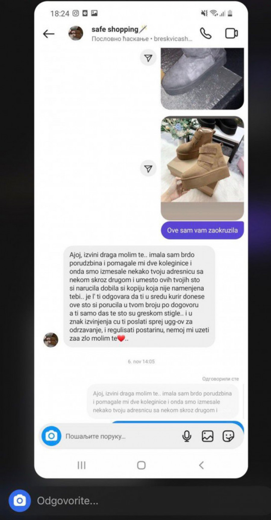- Unutra su bile neke čizme koje uopšte nisam poručila. Manjeg broja i druge boje, očajnog kvaliteta. Kao da su od kartona i plastike pravljene, a ne od prevrnute kože, kako su mi administratori te stranice potvrdili u ranijoj prepisci. Odmah sam im pisala na Instagramu da ovo što sam dobila nisam poručila. Oni su ekspresno i veoma ljubazno odgovorili da su zbog velikog broja porudžbina pogrešili adresu i da meni nisu poslali ono što sam htela. Zamolili su me da po kuriru vratim čizmice, ali ne uzimam novac zbog poštarine i da će mi oni za dva dana poslati moj proizvod - rekla je Marijana.