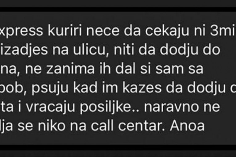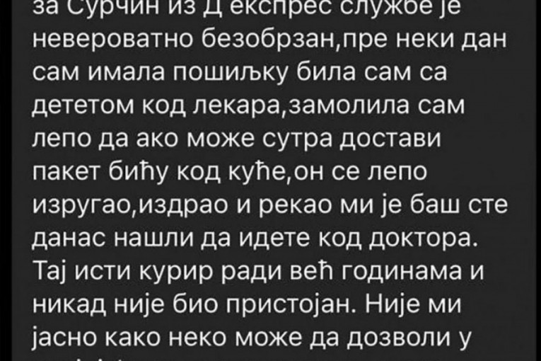 - Čovek koji vozi za Surčin iz "D ekspres" službe je veoma bezobrazan. Pre neki dan imala sam pošiljku, a bila sam s detetom kod lekara. Zamolila sam lepo ako može sutradan da dostavi paket jer ću tada biti kod kuće. On mi se, međutim, lepo izrugao, izdrao i rekao: "Baš ste danas našli da idete kod doktora." Taj isti kurir radi već godinama i nikada nije bio pristojan - iskustvo je jedne Beograđanke objavljeno na Instagram stranici Serbialive Beograd.