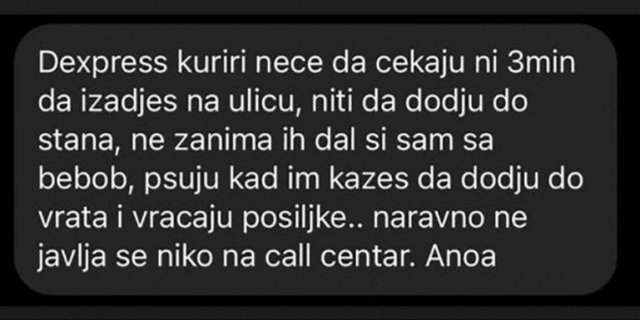 - "D ekspres" kuriri neće da čekaju ni tri minuta da izađeš na ulicu niti hoće da dođu do stana. Ne zanima ih ni da li si sam s bebom, psuju kad im kažeš da dođu do vrata. Naravno, u kol-centru se ne javlja niko - istakla je jedna Beograđanka.