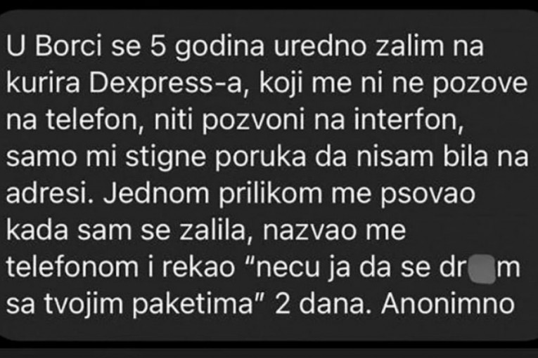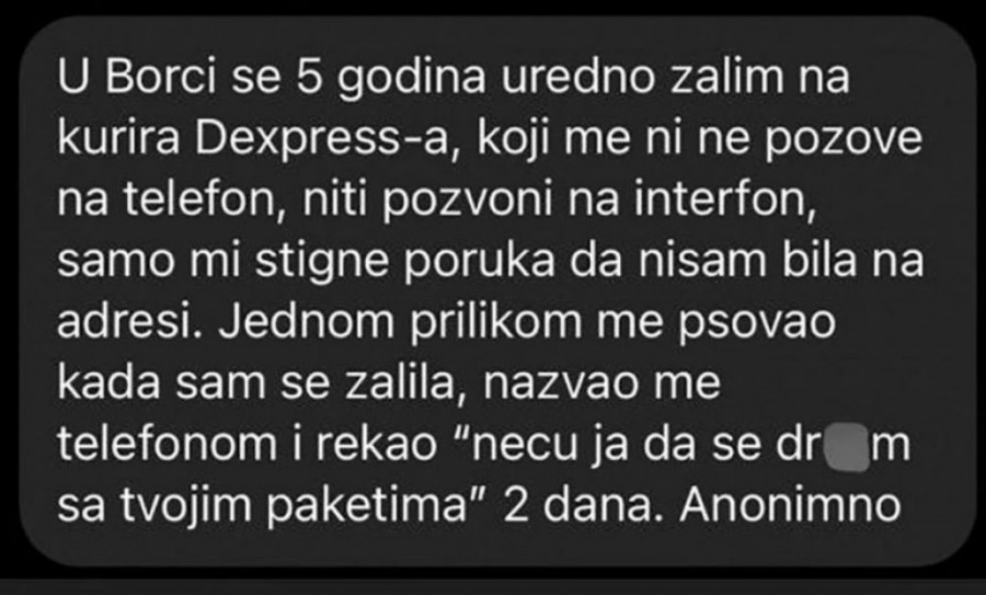 - U Borči se pet godina uredno žalim na kurira "D ekspresa", koji me čak i ne pozove telefonom niti pozvoni na interfon. Samo mi stigne poruka da nisam bila na adresi. Jednom prilikom me je psovao kada sam se žalila, nazvao me je telefonom i rekao: "Neću ja da se dr*am s tvojim paketima dva dana."