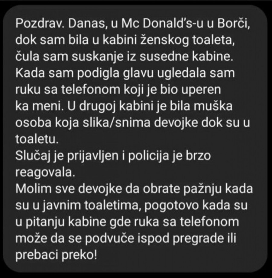 - Pozdrav. Danas, u Mc Donald's-u u Borči, dok sam bila u kabini ženskog toaleta, čula sam šuškanje iz susedne kabine. Kada sam podigla glavu ugledala sam ruku sa telefonom koji je bio uperen ka meni. U drugoj kabini je bila muška osoba koja slika/snima devojke dok su u toaletu. Slučaj je prijavljen i policija je brzo reagovala. Molim sve devojke da obrate pažnju kada su u javnim toaletima, pogotovo kada su u pitanju kabine gde ruka sa telefonom može da se podvuče ispod pregrade ili prebaci preko! - izjavila je devojka.
