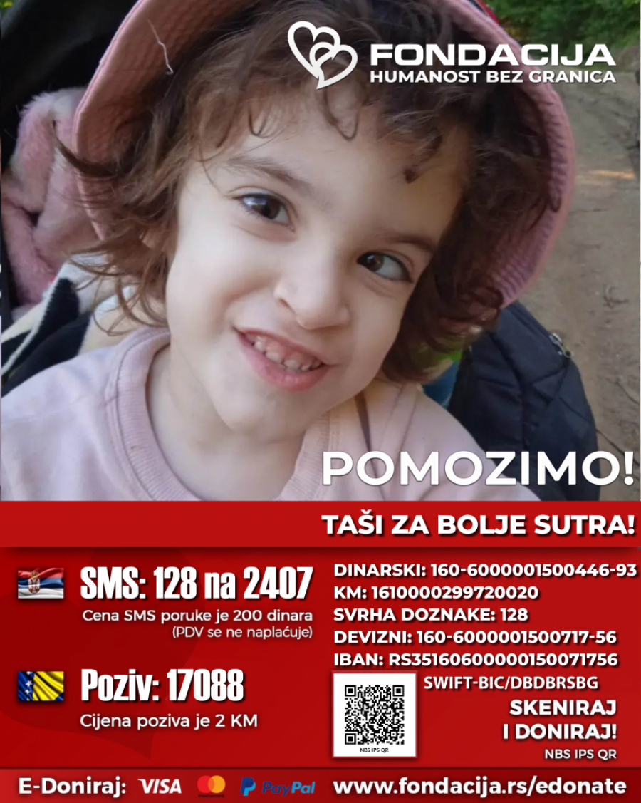 Ovim putem pozivamo sve ljude dobre volje da pomognu Taši za bolje sutra, tako što će preko Fondacije – humanost bez granica, iz Srbije poslati SMS sa brojem 128 na 2407 a iz Bosne i Hercegovine pozvati broj 17088.