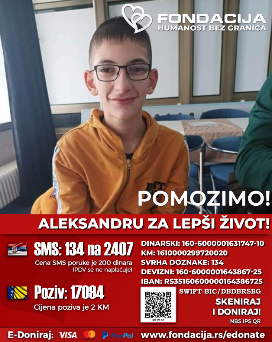 Porodica nije u mogućnosti da sama finansira lečenje i ovim putem pozivamo sve ljude dobre volje da pomognu Aleksandru da što pre sakupi sredstva za naredne tretmane matičnim ćelijama tako što će preko Fondacije – humanost bez granica, iz Srbije poslati SMS sa brojem 134 na 2407 a iz Bosne i Hercegovine pozvati broj 17094.