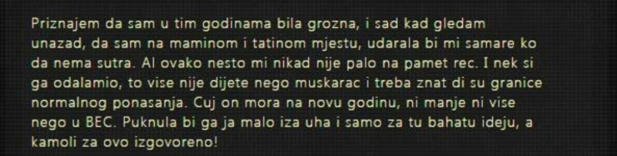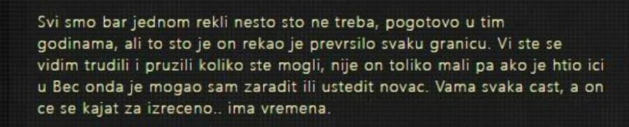 "Godinama smo ko crnci radili žena i ja da i ovaj skroman životni prostor priuštimo i kako-tako sredimo i kupimo skoro 20 godina star auto, školujemo decu, šaljemo na ekskurzije, jezike. Oblačimo se skromno, ne idemo autom do škole/posla, letovanja su skromna i porodična; dočeci Nove godine, izleti, zimovanja nisu nešto što možemo. Neće me niko tako nazivati jer nije mogao na doček Nove s društvom u Beč. To i nisu pravi drugari ako ga po tome odmeravaju, al aj ti to fino objasni napaljenku od 17 godina koji sikće na tebe! Samo mi je žao što je godina ovako počela", kaže tužni otac koji novcem ne može da parira planovima sinovljevog društva.