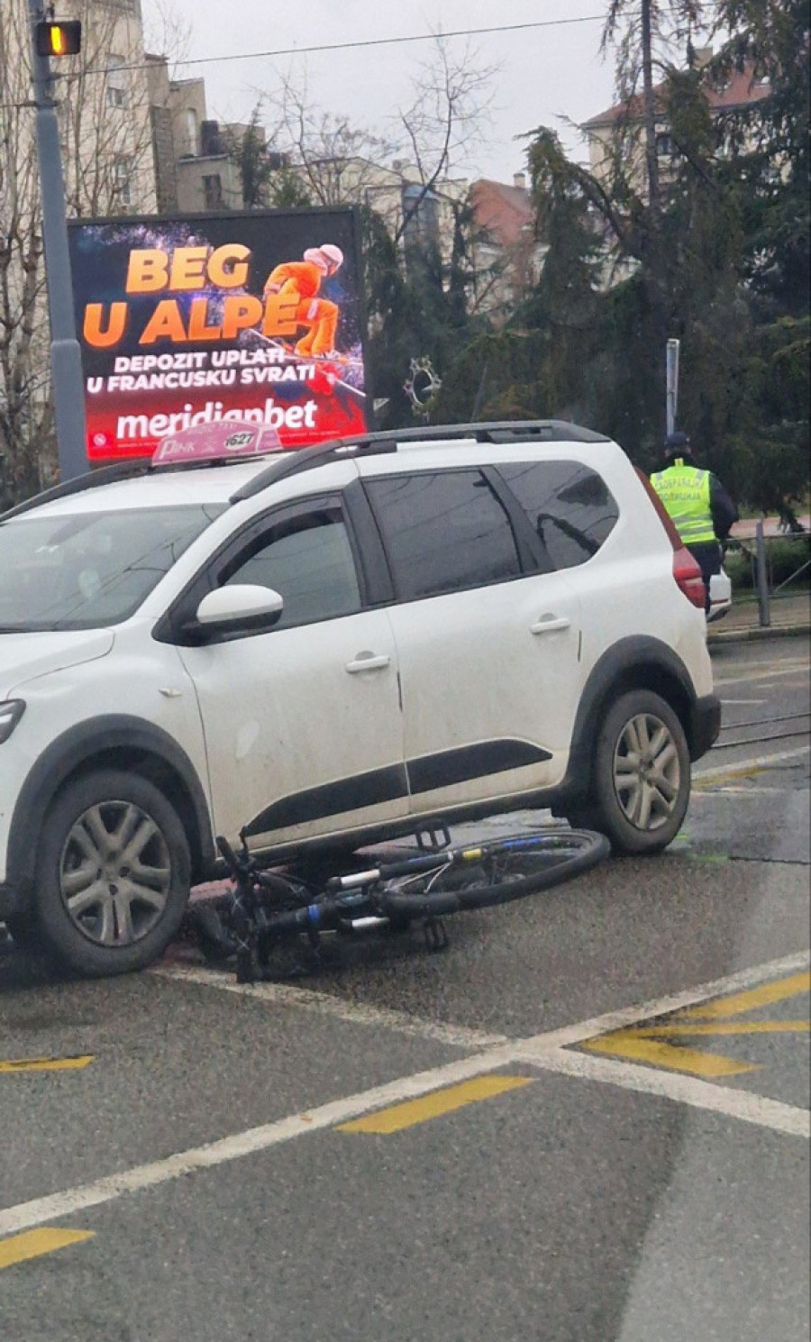 Na fotografijama se vidi da je bahati biciklista Volta, verovatno presekao saobraćaj na kružnom toku na Slaviji i podleteo pod nadolazeći taksi.