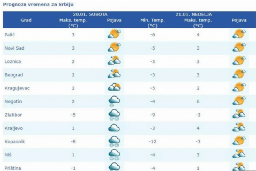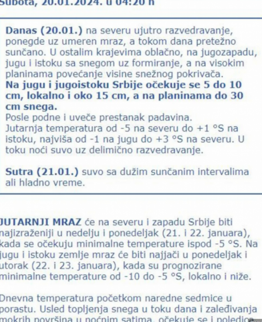 Jutarnji mraz će na severu i zapadu Srbije biti najizraženiji u nedelјu i ponedelјak (21. i 22. januara), kada se očekuju minimalne temperature ispod -5 °S. Na jugu i istoku zemlјe mraz će biti najjači u ponedelјak i utorak (22. i 23. januara), kada su prognozirane minimalne temperature od -10 do -5 °S, lokalno i niže. Dnevna temperatura početkom naredne sedmice u porastu. Usled toplјenja snega u toku dana i zaleđivanja mokrih površina u noćnim satima, očekuje se i poledica", stoji u najavi RHMZ.