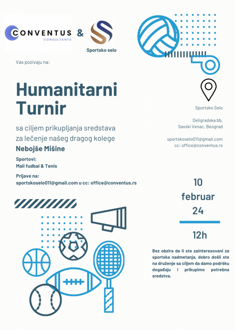 - Pozivamo Vas da uzmete učešće na humanitarnom sportskom događaju koji zajedno sa Sportskim selom organizujemo sa ciljem da prikupimo potrebna sredstva za lečenje našeg dragog kolege i prijatelja Nebojšu Mišinu. Humanitarni sportski događaj će se održati 10.02.2024. u Sportskom selu. Planiran je turnir u malom fudbalu kao i u tenisu. Molimo kompanije da svoje ekipe prijave do 07.02.2024. putem email-a na adresu: sportskoselo011@gmail.com, a u cc email-a: office@conventus.rs