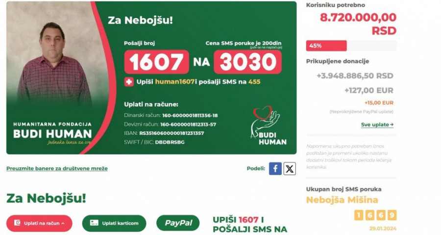Mišinu je potrebno 8.720.000 dinara, a do sada je prikupljeno oko 45 odsto sredstava. Za Nebojšu možete uplatiti novac na jedan od računa (navedeni na slici) ili slanjem sms poruke 1607 na broj 3030.