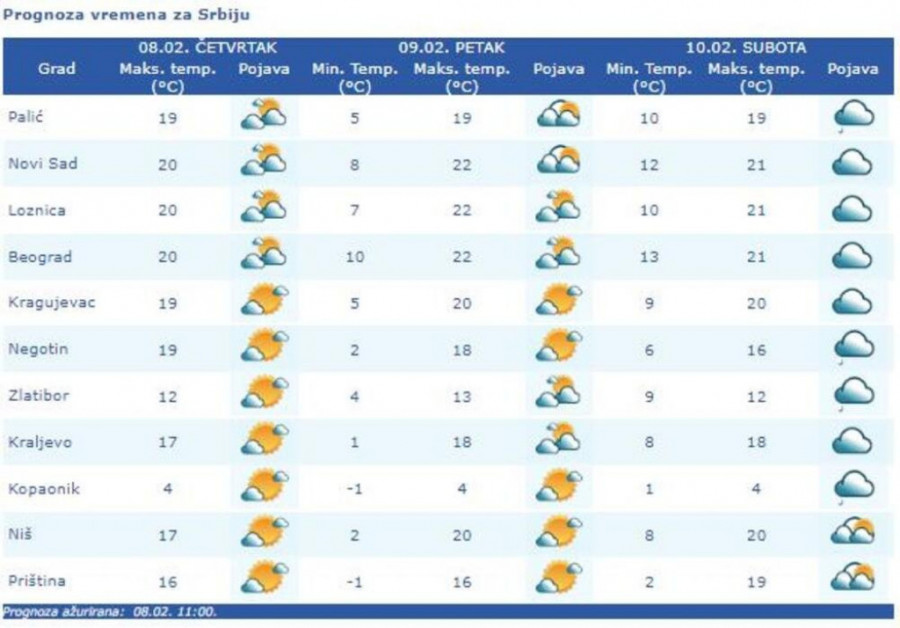 Tokom narednih dana, očekuju se izražena dnevna kolebanja temperature, naročito van većih urbanih sredina u centralnoj i južnoj Srbiji. Minimalne temperature će se kretati od -2 do 2 stepena, dok će najviše dnevne temperature lokalno dostizati čak do 20 stepeni. Međutim, za vikend se predviđa značajno smanjenje dnevnih temperaturnih oscilacija usled povećanja oblačnosti i pojačanja vetra.