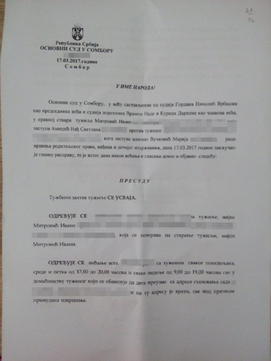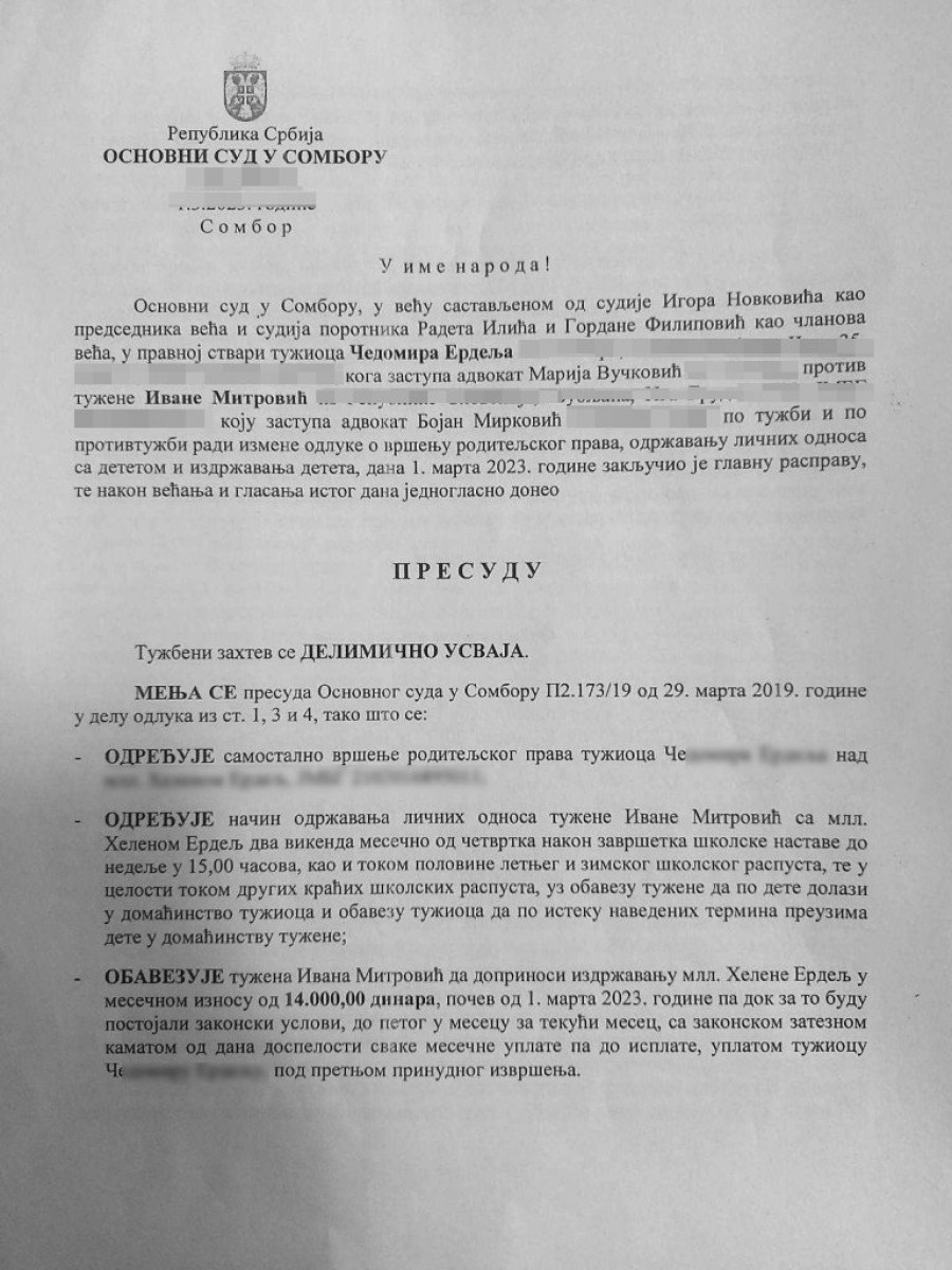 - Postupak i dalje teče. Pored donete presude, u predmetu je doneto i rešenje kojim je određena privremena mera do pravosnažnog okončanja predmetnog postupka kojom je određeno samostalno vršenje prava nad detetom od ostane Č. E., te je određen način održavanja ličnih odnosa majke s detetom. Što se tiče upita u vezi nasilja u porodici za oca, obaveštavamo vas da je rešenjem suda 2021. doneta mera zabrane prilaska žrtvi nasilja, ali prema Č. E. nisu pokretani niti vođeni postupci zbog krivičnog dela nasilje u porodici, tako da je on po evidenciji neosuđivan. Nemamo saznanja o bilo kakvom postupanju Č. E. koje je u suprotnosti sa sudskom odlukom - navode iz suda.