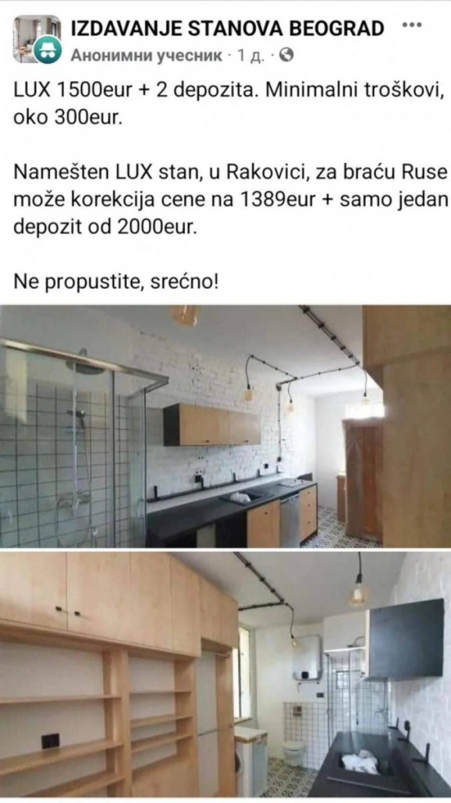 Na popularnoj grupi "Izdavanje stanova Beograd" nedavno se pojavio oglas koji je izazvao dosta pažnje i polemike. Naime, stanodavac je istakao da izdaje luksuzan stan po ceni od 1.500 evra, ali je takođe naveo da će Rusima ustupiti isti stan po nižoj ceni od 1.389 evra.