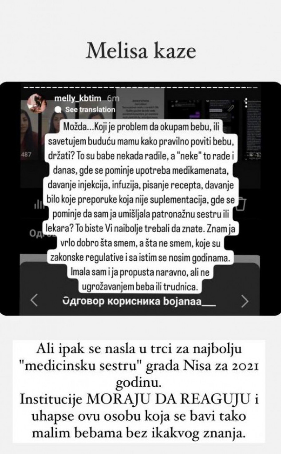 Nakon što je shvatila da je otišlo predaleko, Melisa je počela da piše i govori kako nikada nije tvrdila da je pedijatrijska sestra niti medicinski radnik bilo koje vrste, već da je influenser koji pomaže majkama.