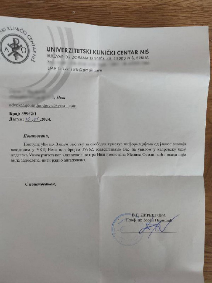 Nakon opsežnih istraživanja, kao i dosta poslatih mejlova na adrese raznih institucija, kako državnih, tako i privatnih, došla je do šokantnog otkrića. Klinički centar Niš se oglasio tim povodom oštro demantujući da je ona ikada bila zaposlena kod njih.