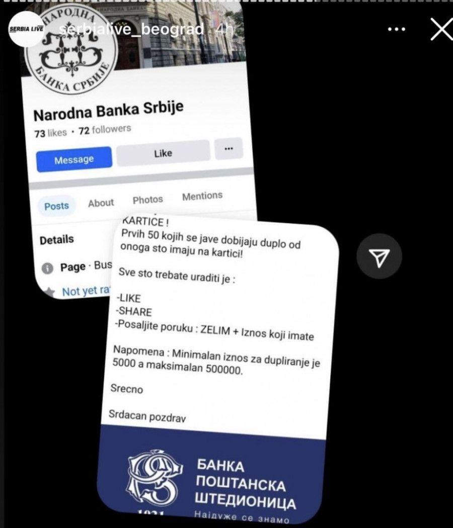 Na društvenim mrežama nedavno se ponovo pojavila lažna stranica koja se predstavlja kao Narodna banka Srbije, a prevaranti na njoj nude dupliranje novca korisnicima dina kartice. Ova prevara je veoma slična prethodnim pokušajima prevare, a pojedini građani su upozorili javnost na ovu prevaru. Foto: Printscreen/Instagram/serbialive_beograd