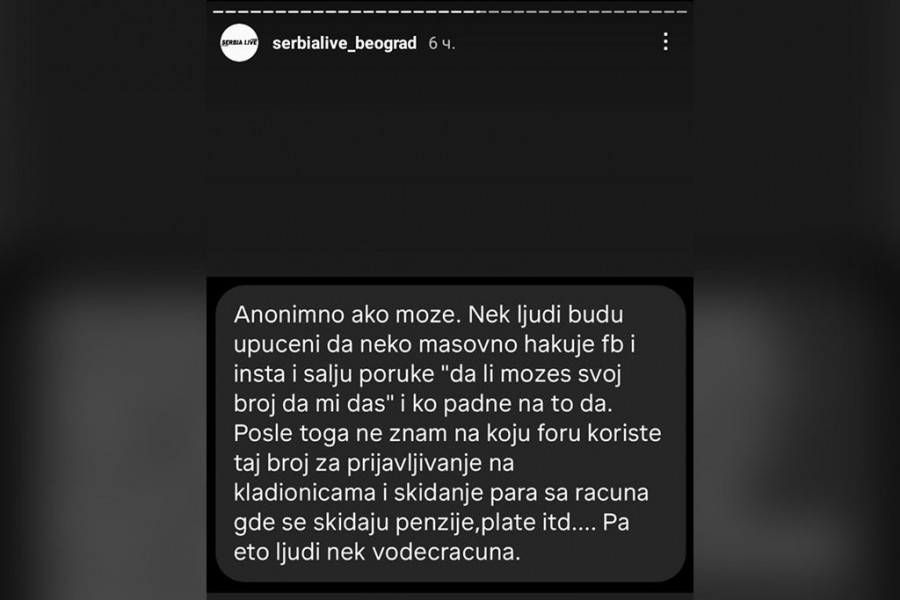 - Naka ljudi budu upućeni da neko masovno hakuje Fejsbuk i Instgram i šalju poruke: "Da li možeš svoj broj da mi daš" i ko padne na to da. Posle toga ne znam na koju foru koriste taj broj za prijavljivanje na kladionicama i skidanje para sa računa gde se skidaju penzije, plate itd... Pa, eto, ljudi neka vode računa - napisala je ona.