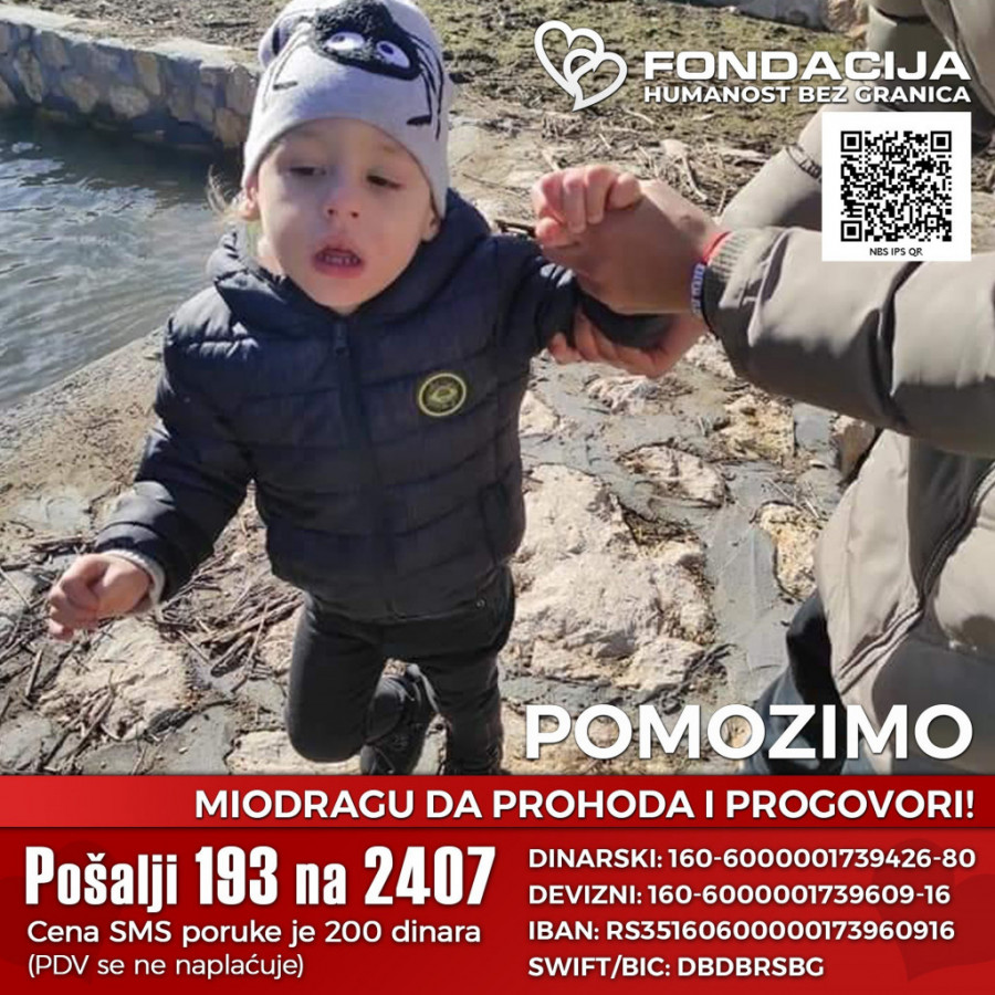 Ovim putem molimo sve ljude dobre volje da pomognu Miodragu za prvi korak i prvu reč, tako što će preko FONDACIJE – humanost bez granica poslati SMS sa brojem 193 na 2407. Uplate za pomoć u lečenju mogu da se izvrše i na dinarski i devizni račun korisnika i putem E-doniraj internet plaćanjem platnim karticama iz celog sveta, kao i preko platforme PayPal.