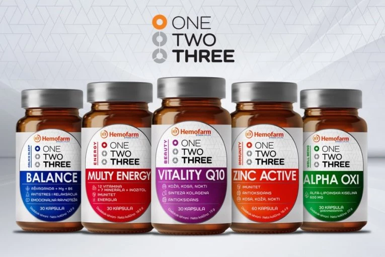 Ukoliko zahtevamo da proizvodi ne sadrže dodate šećere, laktozu, gluten i zaslađivače, da budu pogodni i za vegane, a supstance u oblicima koji omogućavaju visok stepen bioraspoloživosti i iskoristljivosti u organizmu, tada posežemo za One Two Three proizvodima Hemofarma. Svaki od pet segmenata preparata ima svoju boju: mir i san - plava, energija - crvena, lepota - ljubičasta, imunitet - narandžasta, i blagostanje – zelena, a svi se nalaze u staklenim bočicama.