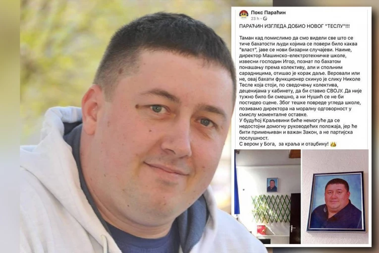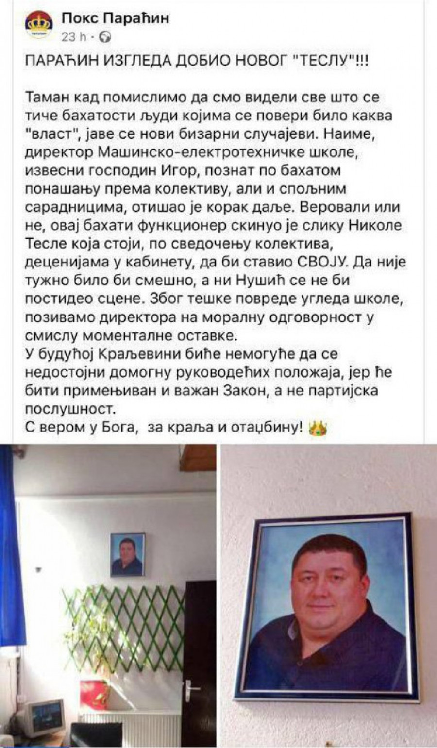 - Taman kad pomislimo da smo videli sve što se tiče bahatosti ljudi kojima se poveri bilo kakva "vlast", jave se novi bizarni slučajevi. Naime, direktor Mašinsko- elektrotehničke škole, izvesni gospodin Igor, poznat po bahatom ponašanju prema kolektivu, ali i spoljnim saradnicima, otišao je korak dalje. Verovali ili ne, ovaj bahati funkcioner skinuo je sliku Nikole Tesle koja stoji, po svedočenju kolektiva, decenijama u kabinetu, da bi stavio svoju. Da nije tužno bilo bi smešno, a ni Nušić se ne bi postideo scene. Zbog teške povrede ugleda škole, pozivamo direktora na moralnu odgovornost u smislu momentalne ostavke. U budućoj Kraljevini biće nemoguće da se nedostojni domognu rukovodećih položaja, jer će biti primenjivan i važan zakon, a ne partijska poslušnost. S verom u Boga, za kralja i otadžbinu - navodi se u postu.