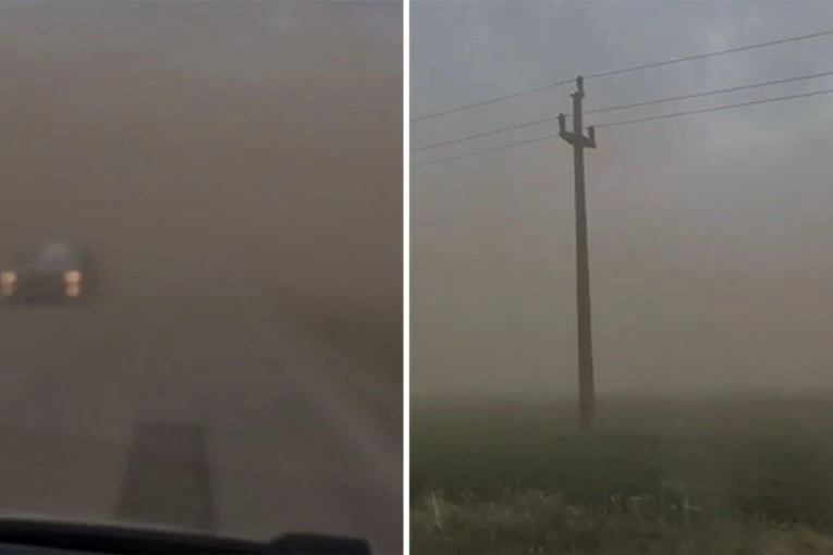 - Ovakvo je stanje na severozapadu Vojvodine. Prašinska oluja, izolovane oluje sa pljuskovima, grmljavinom i olujnim vetrom. Olujni, izolovano orkanski, vetar podiže prašinu i smanjuje vidljivost na 0 metara - stoji u opisu snimka koji su podelile Instagram stranice hailz_srbija i 192_rs.