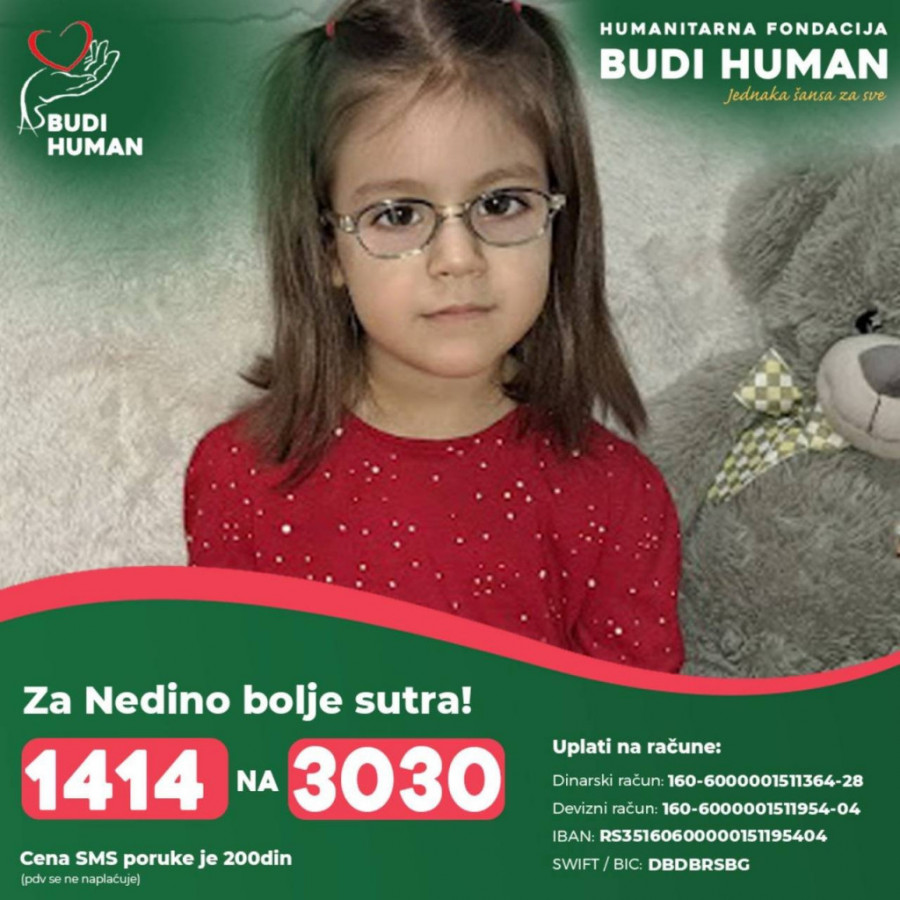- Potrebno nam je 6.000 evra za terapiju matičnim ćelijama, kao i da bi imali još mesec dana za vežbanje. Neda zaostaje mentalno i fizički zbog tog sindrom,a nadamo se da će novom terapijom matičnim ćelijama da napreduje mentalno. Pored tog, redovno ide vežba sa logopedom, defektologom i ide na fizikalne terapije. Kod Nede je od rođenja vidljiv problem, ali nije bio poznat uzrok sve do prošle godine kada smo saznali dijagnozu posle brojnih ispitivanja. Ne postoji lek za PURA sindrom, i pošto Neda puni pet godina u junu, ističe nam to neko vreme za najveći napredak, zato smo odlučili da pokušamo sa terapijom matičnim ćelijama u Turskoj. Termin za prvu dozu nam je 7. maj, pa bi trebali novac da sakupimo do kraja aprila. - kazala je i dodala: