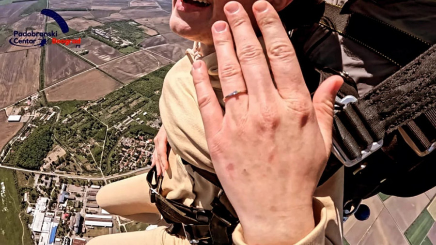 - Kada je videla da idemo za Beograd umalo se nismo posvađali, a kad je videla da smo došli na poligon za poletanja i da ćemo skakati sa 3.000 metara nadmorske visine tek tad je ostala bez reči. Ali, nije znala da najveće iznenađenje tek sledi. Kad smo bili spremni, nekoliko trenutaka pred sam skok, pilot mi je dodao prsten, njoj je isntruktor rekao da mi pruži ruku i ja sam joj samo stavio prsten. Ništa je nisam ni pitao, morala je da pristane, priča kroz osmeh budući mladoženja.