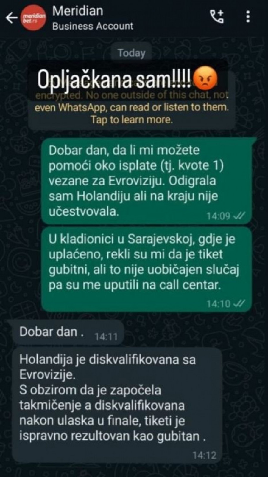 Devojka iz Beograda (svi podaci poznati redakciji), koja je u kladionici "Meridianbet" igrala tiket na pesmu Evrovizije, doživela je neprijatno iskustvo s ovom kladionicom. Iskustvo koje je direktno nazvala pljačkom.