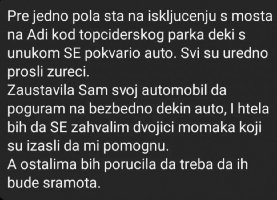 Jedna Beograđanka odlučila je da podeli svoje iskustvo na društvenim mrežama nakon što je svedočila nečemu što je duboko dirnulo njeno srce. Na isključenju sa mosta na Adi, deki sa unukom se pokvario automobil, a većina ljudi je samo žurila pored, ne obazirući se na njihovu situaciju.