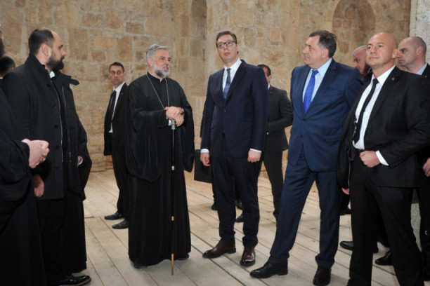 Foto: Tanjug/D. GOLLVladika je, nakon obilaska radova na obnovi Saborne crkve Svete trojice u Mostaru sa predsednikom Srbije Aleksandrom Vučićem i RS Miloradom Dodikom, rekao da je srećan što je imao priliku da to učini sa dva predsednika srpskog naroda.