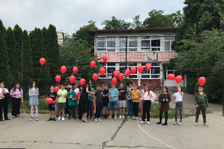 Pripremili su 26 crvenih helijumskih balona na kojima je pisalo "Mi smo Dušankina deca!". Kada je njihova učiteljica, Dušanka Mladenović, izašla na dvorište škole, gde su je čekali, pustili su ove balone u vazduh.