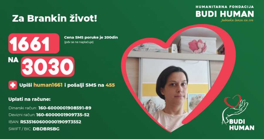 Branki Dejanović možete pomoći slanjem SMS poruke sa sadržajem 1661 na 3030.