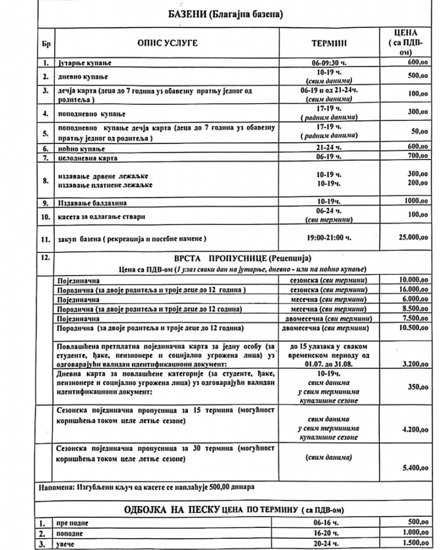 Dnevna karta košta 600 dinara, a dečija dnevna je 220 dinara. Za decu do dve godine ulaz je besplatan, a deca mlađa od 12 godina na bazen mogu ući samo u pratnji punoletne osobe.