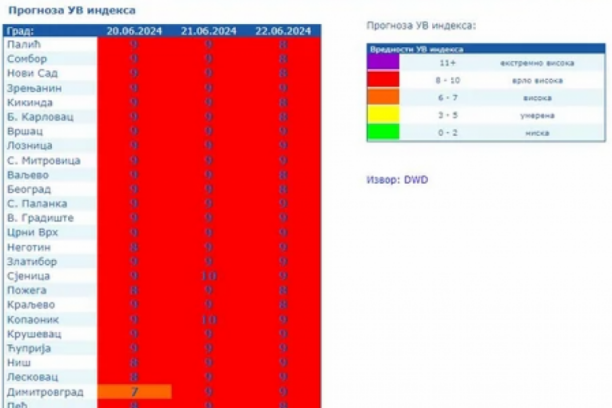 I tabela UV indeksa koju prognozira RHMZ se crveni i to cela, za danas i naredna dva dana. Prognozora se vrlo visok UV indeks.