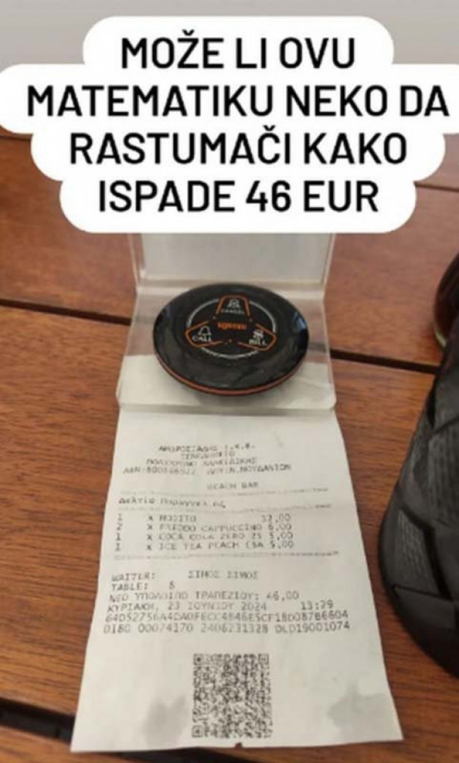 Kako je Željko uslikao račun, mnogi su na delu mogli da uvide prevaru. Narućen je jedan mohito, koji je iznosio 12 evra, dva kapućina po 6 evra, što je ukupno 12, i takođe jedan sok kao i ledeni čaj koji su iznosili po 5 evra. Prostom računicom dobija se iznos od 34 evra, ali ne i ako pitate konobara.