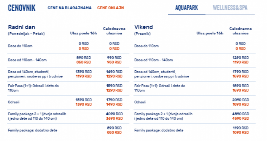 Ukoliko želite da platite kartu za samo jedan dan, odrasle će to stajati 1.490 dinara, stariju decu, penzionere i studente 1.290 dinara, a mlađu decu 950 dinara. Porodične karte uključuju dva roditelja i jedno dete i ona je 3.690 dinara, dok se za ostalu decu doplaćuje još 850 dinara, što u prevodu znači da jedna četvoročlana porodica mora nešto više od 4.500 dinara.