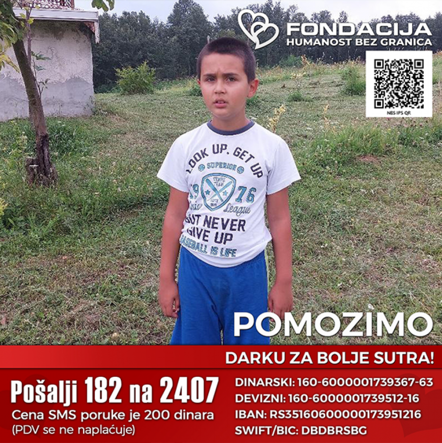 Ovim putem pozivamo sve ljude dobre volje da pomognu Darku za bolje sutra, tako što će preko Fondacije – humanost bez granica poslati SMS sa brojem 182 na 2407. Uplate za pomoć u lečenju mogu da se izvrše i na dinarski i devizni račun korisnika i putem E-doniraj internet plaćanjem platnim karticama iz celog sveta, kao i preko platforme PayPal.