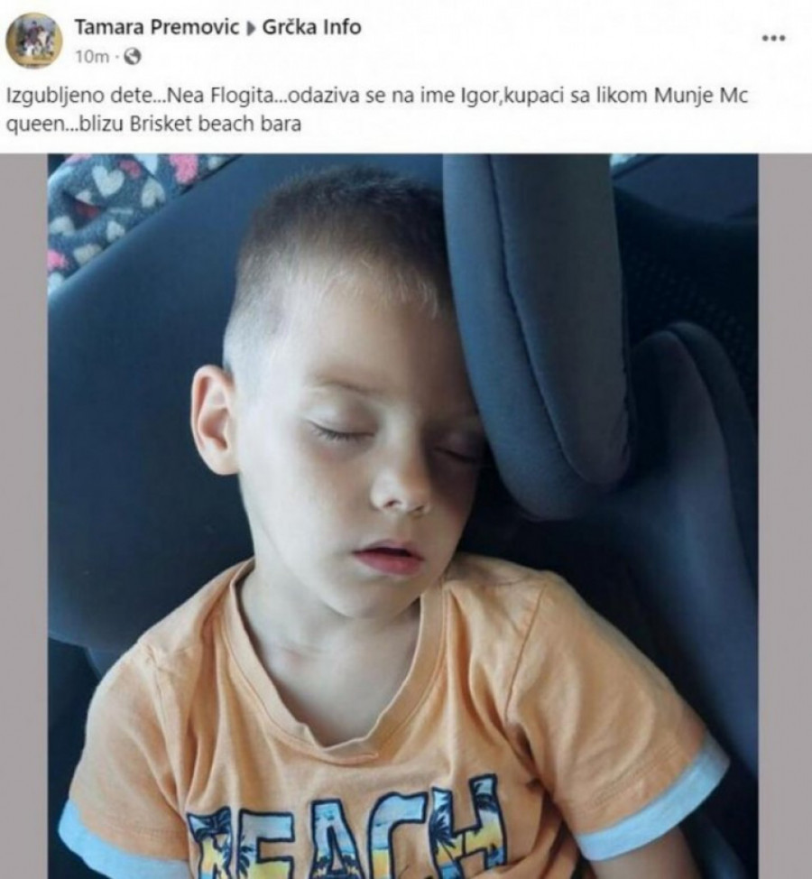 Prema informacijama koje se dele na Fejsbuk stranici "Grčka info", na plaži u letovalištu Nea Flogita u Grčkoj nestao je dečak Igor (5).