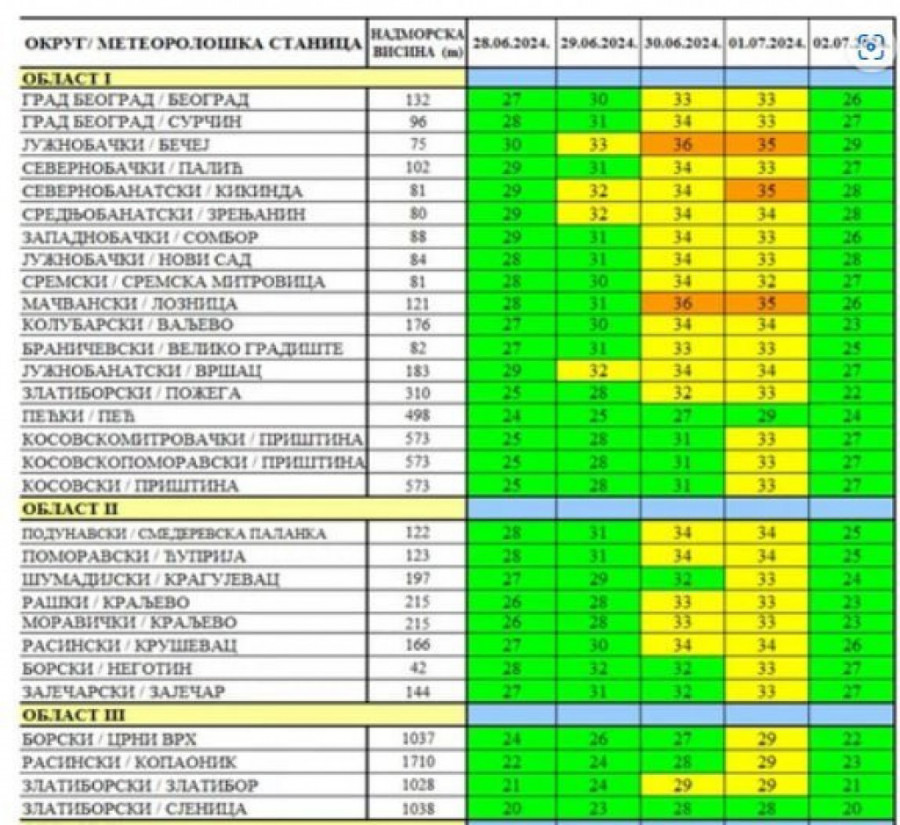 Kada u tabeli ima narandžastih polja, to znači da se u tim mestima očekuje vreme rizično po zdravlje.