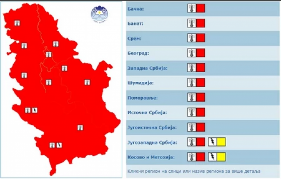 RHMZ je izdao crveni meteoalarm za celu Srbiju zbog ekstremnih temperatura, dok je za subotu na snazi žuti meteoalarm zbog mogućnosti grmljavine u jugozapadnoj Srbiji i na Kosovu i Metohiji.