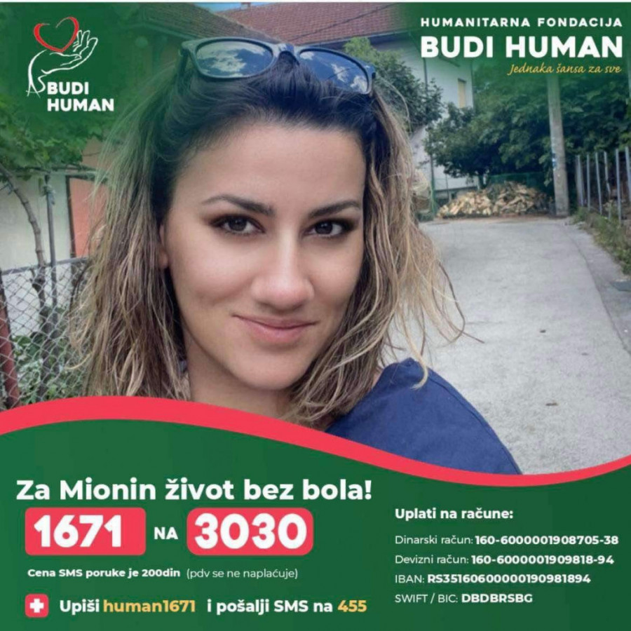 Miona Miletić se nalazi u veoma teškoj zdravstvenoj i životnoj situaciji. Za dva nepuna dva meseca od kad je prijavljena u fondaciji prikupljeno samo 23 odsto sredstava. Samohrana je majka devetogodišnjeg dečaka koji takođe ima zdravstveni problem - vrlo retko oboljenje Van Neck Oldenberg. Zbog rasta i razvoja, hirurško lečenje nije moguće jer bi dovelo do skraćenja jednog od donjih ekstremiteta. Lekari su predložili praćenje stanja do završetka rasta i razvoja, kada bi trebalo da se višak kostiju ukloni. Dečak trpi svakodnevne bolove i pije analgetike, a majka je nemoćna da mu pomogne zbog sopstvenog zdravstvenog stanja.