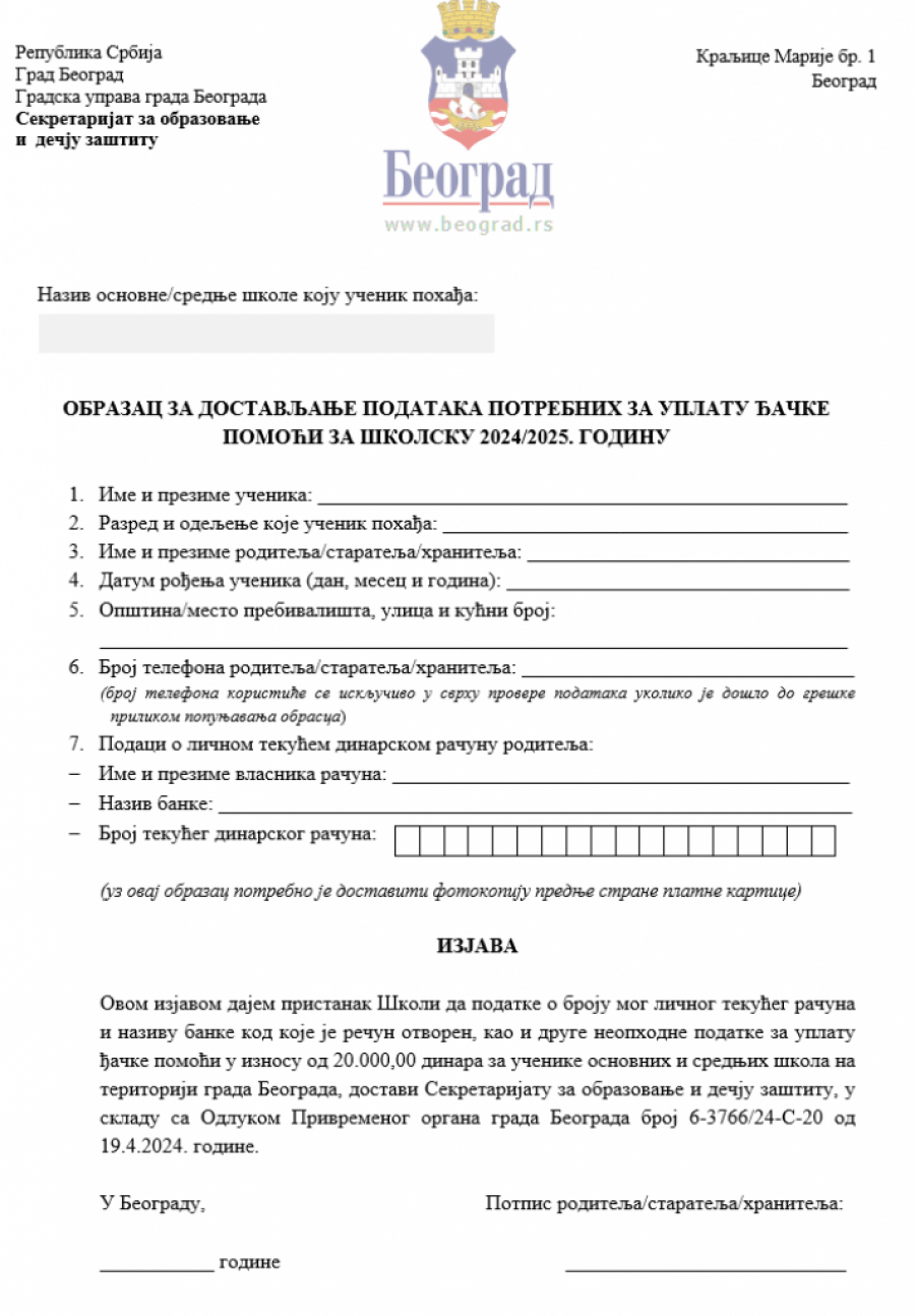 Iz Sekretarijata za obrazovanje i dečju zaštitu Grada Beograda stiglo je pojašnjenje „ako roditelj ne želi da priloži kopiranu prednju stranicu kartice – da dostavi potvrdu iz banke na kojoj se jasno vidi ime vlasnika i broj tekućeg računa“.