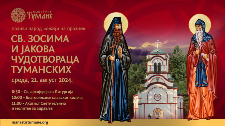 - Manastir Tumane je mesto velikih isceljenja u kojem se čuda dešavaju oduvek, a posebno u ovo novo vreme. Narod, prepoznajući silu Božiju, u najtežim trenucima svoga života traži utehu i blagoslov kod ćivota Svetog Zosima i Svetog Jakova. Iz dana u dan su mnogobrojna svedočanstva o njihovoj pomoći svima koji im pristupe s verom. Pozivamo sve koji vole i poštuju tumanske svetitelje da se u sredu zajedno saberemo u Manastiru Tumanu. Na dan praznika biće objavljeno i jedno veliko čudo svetitelja koje se dogodilo ovih dana - rekao je arhimandrit Dimitrije, iguman Manastira Tumane.