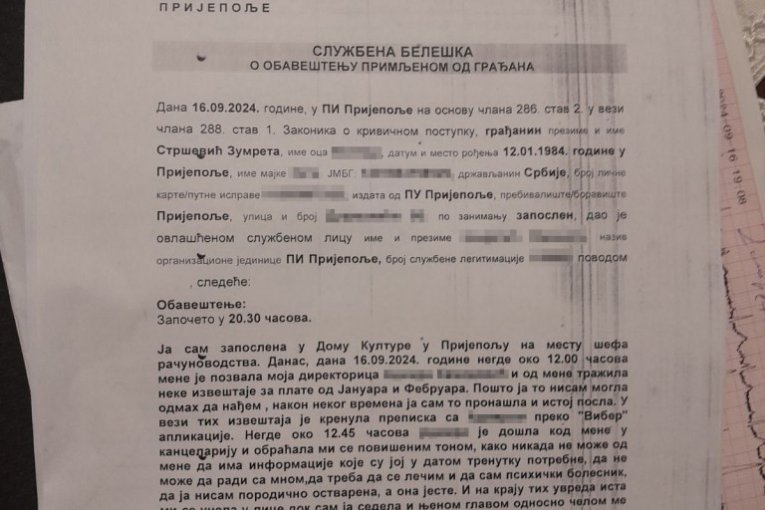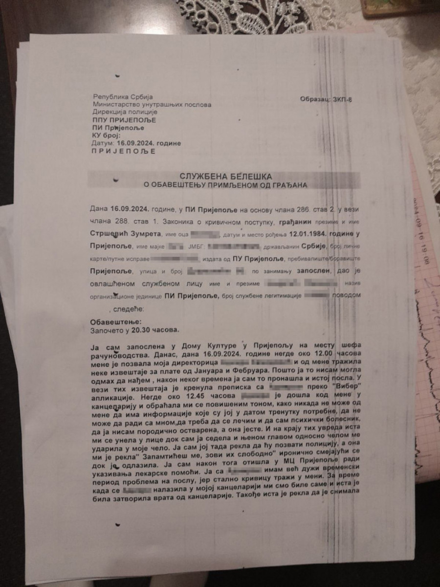 "NAJPRE ME VREĐALA, A ONDA ME UDARILA GLAVOM U ČELO" Evo šta je pretučena radnica u Domu kulture u Prijepolju rekla u policiji! KAŽE DA JE DIREKTORKA IZUDARALA ZBOG IZVEŠTAJA!