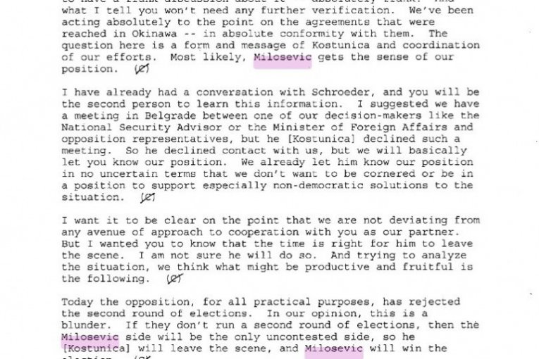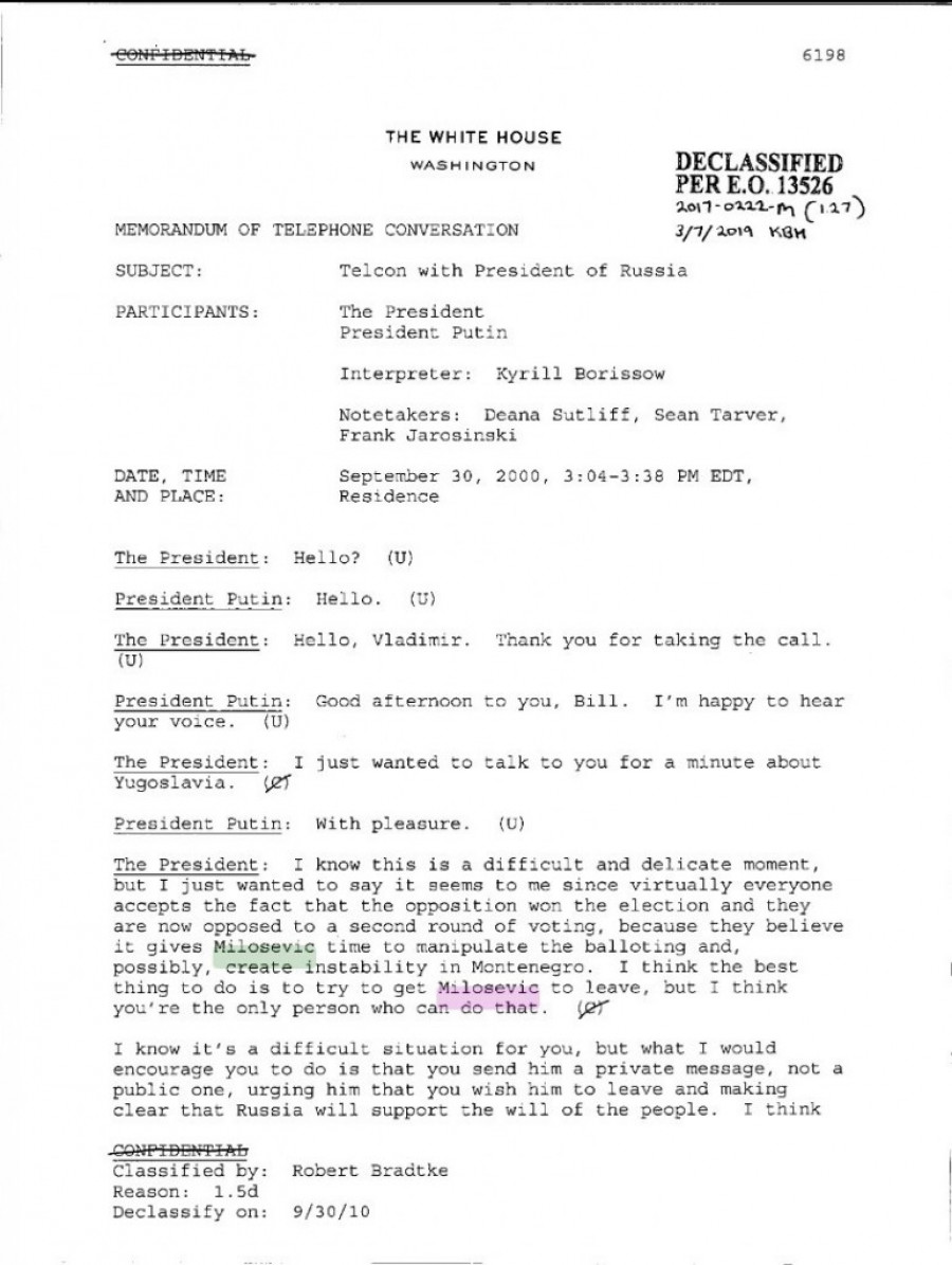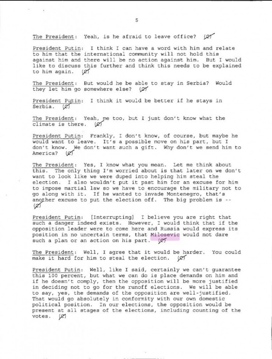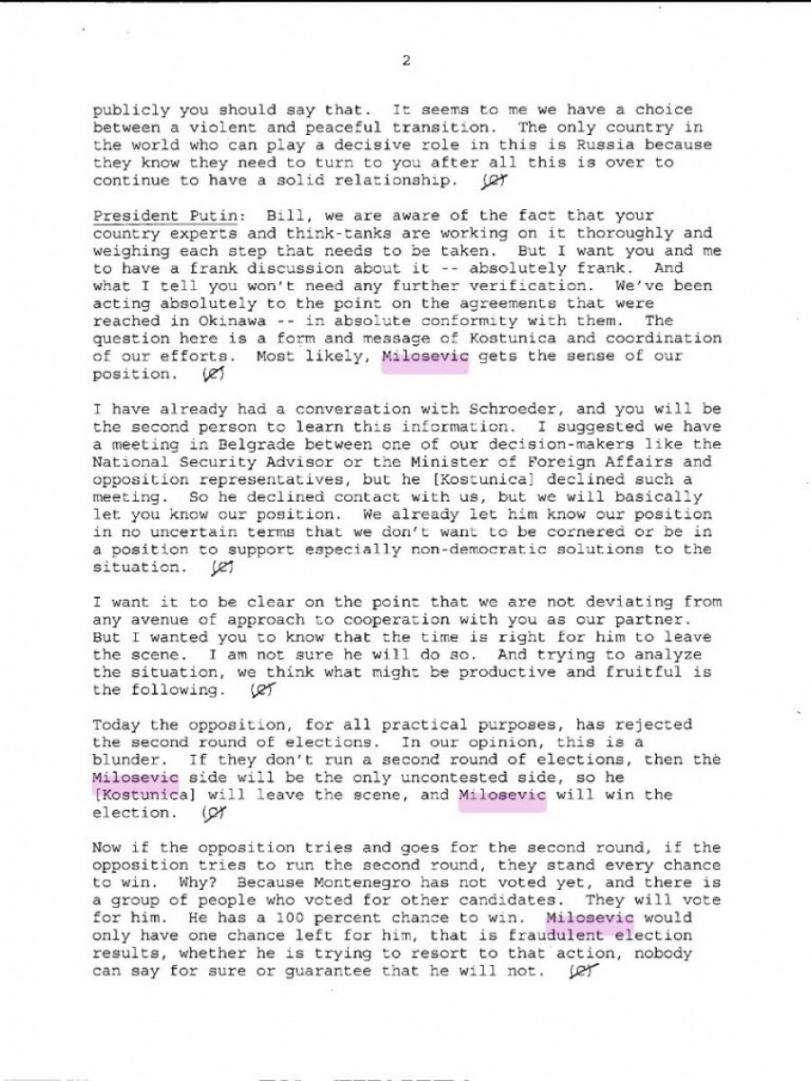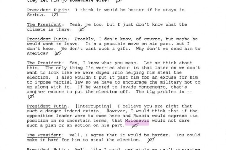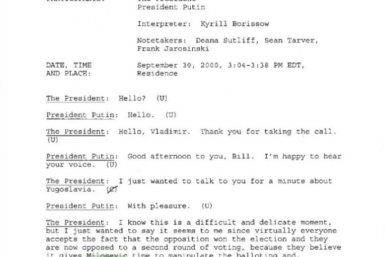 Slobodan Milošević je izgubio izbore 24. septembra 2000, a do kraja meseca Vladimir Putin i Bil Klinton razgovarali su dva puta kako da ga izvedu iz Srbije. Klinton je predlagao da se Milošević skloni u Rusiju, a Putin da ode u Ameriku. Transkripti ovih razgovora objavljeni su u Klintonovoj digitalnoj biblioteci, na koju svaki predsednik ima pravo nakon isteka roka tajnosti.