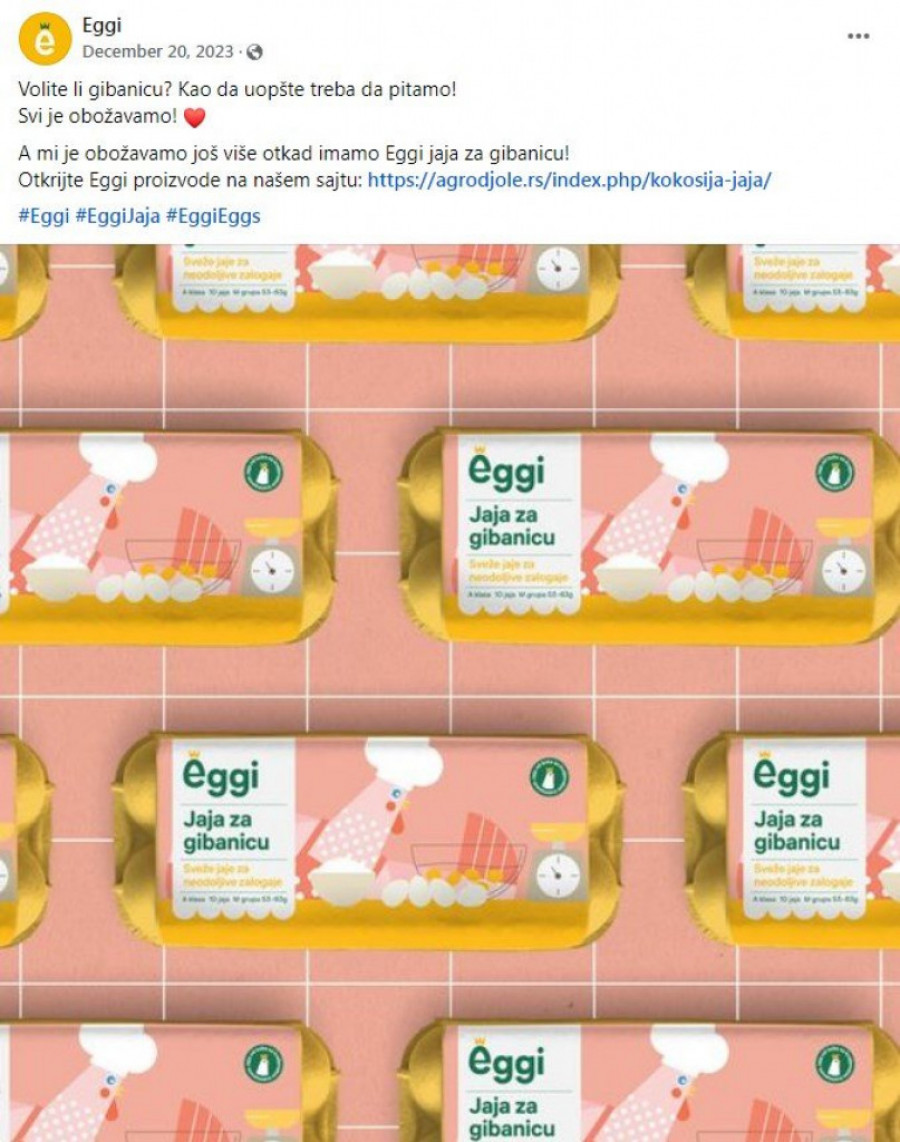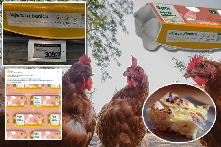 Tako firma "Agro - Đole doo", kao jedan od svojih proizvoda, reklamira "jaja za gibanicu" (eggy), a čija je cena čak 309,99 dinara za 10 komada.