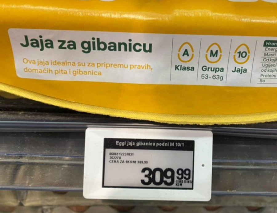 Primera radi, jaja koja se prodaju u okviru akcije najbolja cena koštaju 11 dinara komad, što je gotovo tri puta jeftinije nego pomenuta "jaja za gibanicu". Uostalom, šta je to što neka jaja preporučuje da su baš za gibanicu, a druga, recimo ova od 11 dinara po komadu, ne? I da li je ovde posredi klasična obmana potrošača, a sve da bi se opravdala nerealna cena ove osnovne životne namirnice.