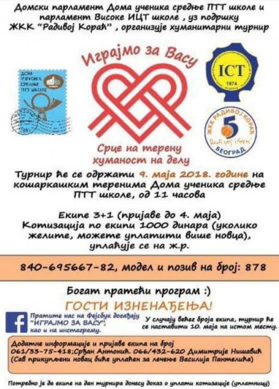 Foto: Promo fotoUz podršku Studentskog parlamenta Visoke ICT škole iz Beograda i ŽKK "Radivoj Korać", Domski parlament Doma učenika srednje PTT škole i ove godine organizuje tradicionalni humanitarni turnir u basketu. Ove godine, učenici organizuju turnir kako bi prikupili novčana sredstava za lečenje dvanaestogodišnjeg dečaka Vasilija Pantelića iz Aranđelovca, koji boluje od nekrotičnog enterokolitisa, odnosno sindroma oštećenja creva sa poremećajem crevne pasaže.