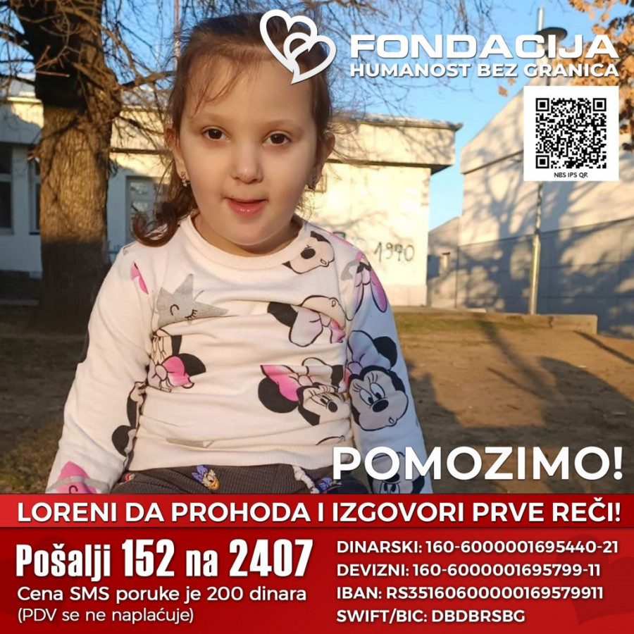 Loreni su potrebna novčana sredstva za matične ćelije, fizijatra, logopedsko defektološke tretmane, fizikalne terapije, kao i za troškove puta i smeštaja.