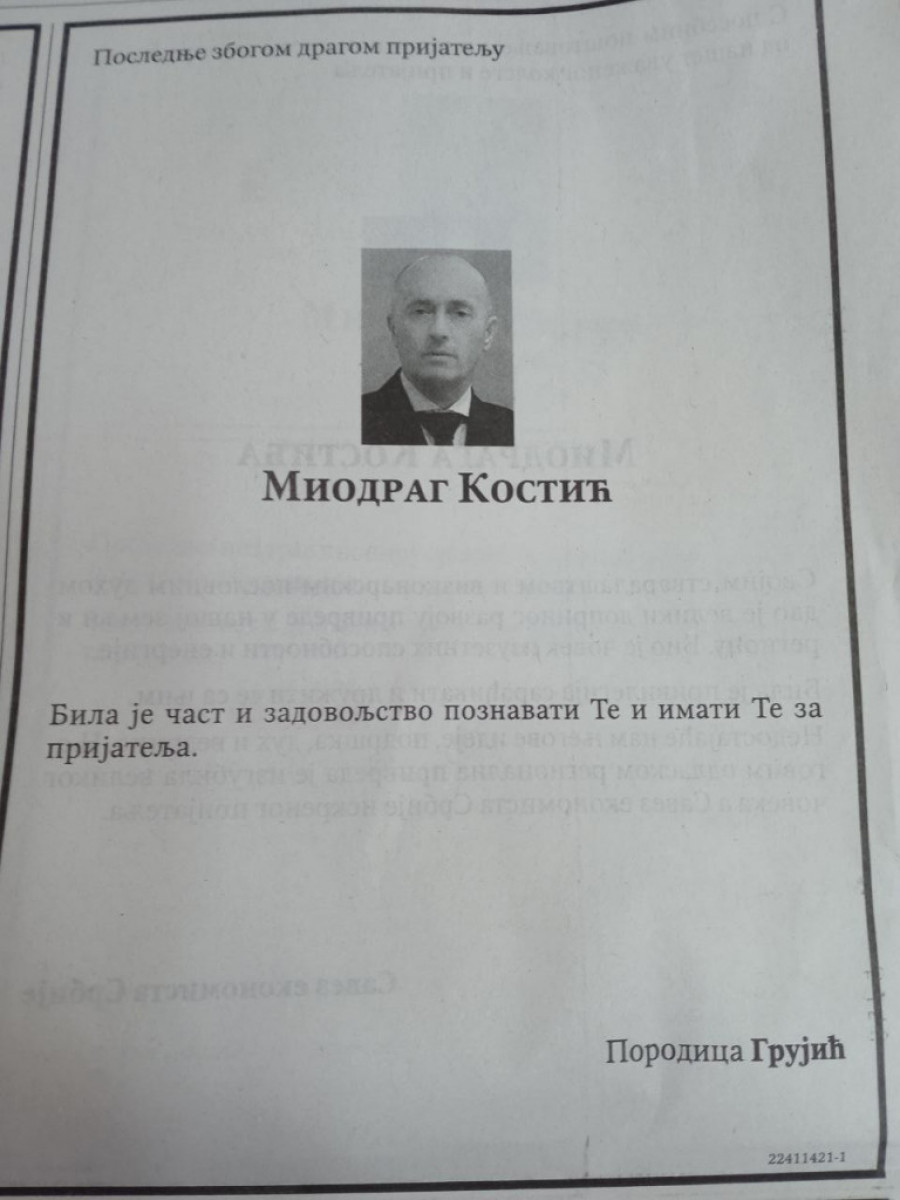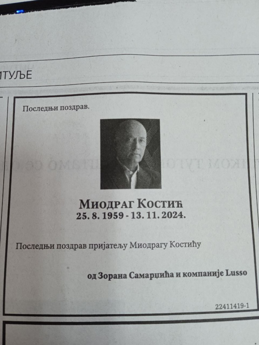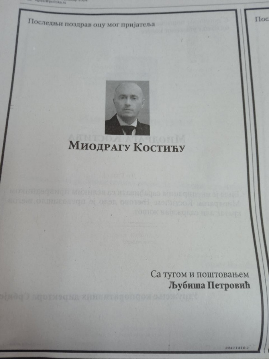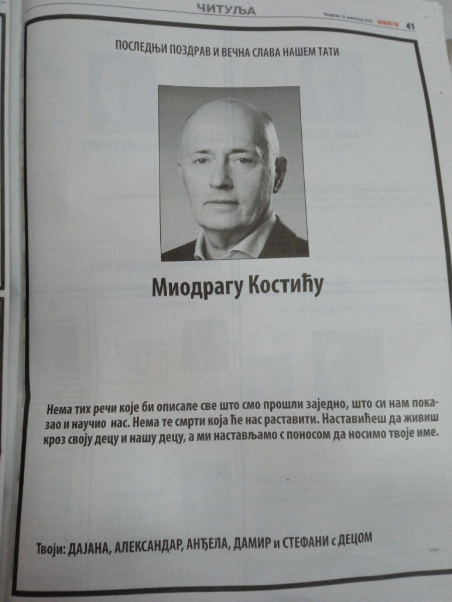 Najpotresniju čitulju objavila je Kostićeva porodica: