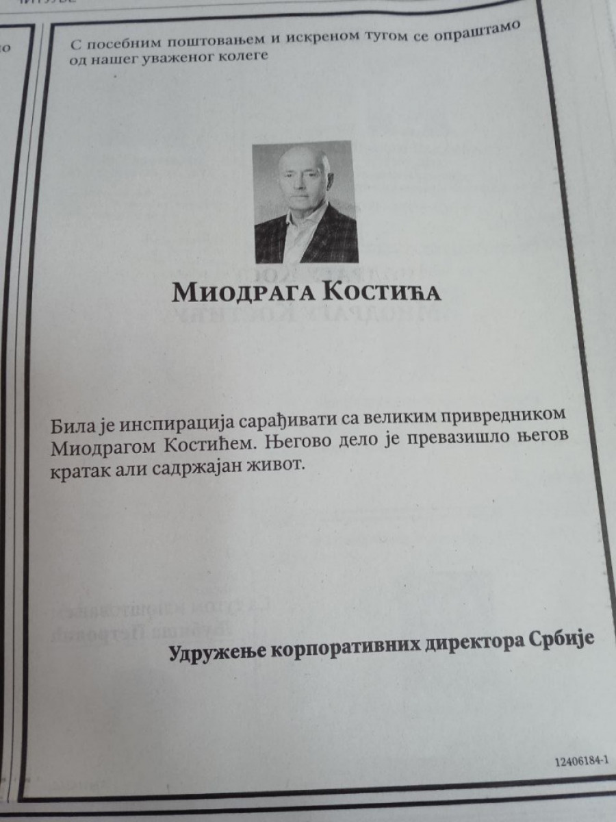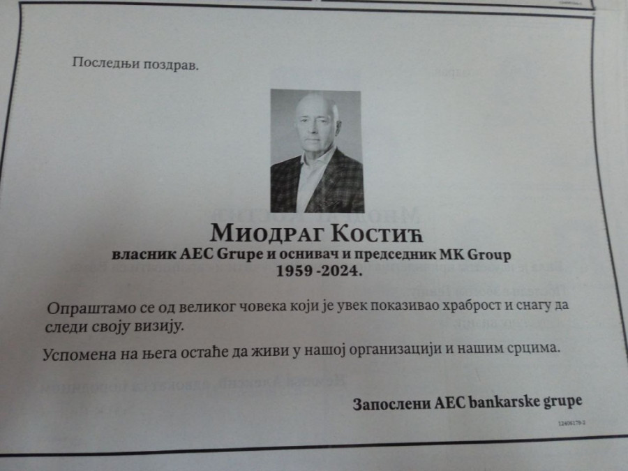 Zaposleni "MK grupe" dali su čitulju u kojoj su se sa velikom tugom oprostili od svog predsednika: